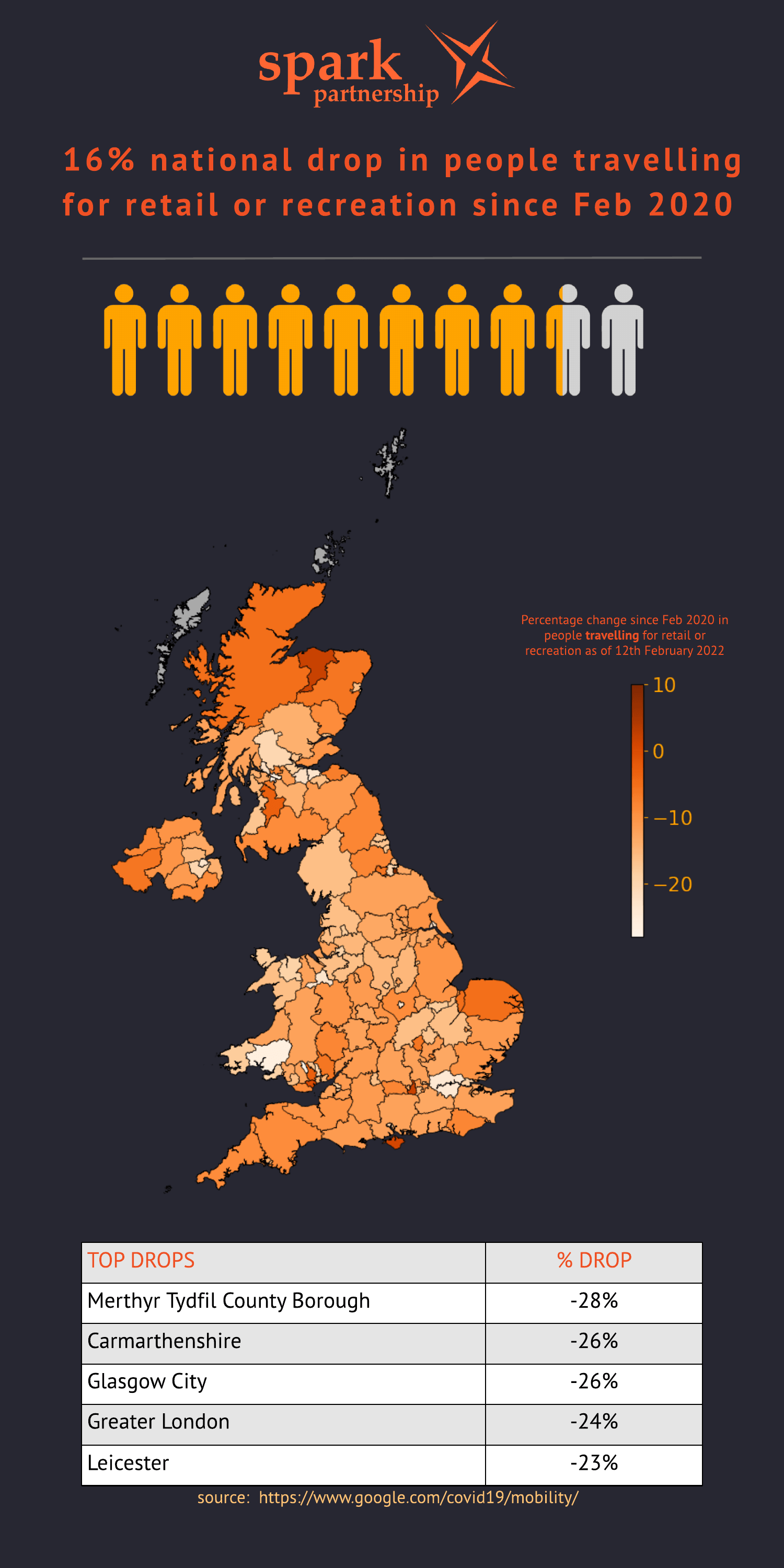 Across the UK as a whole, travel for retail or recreation is down 16 percentage points on pre-pandemic levels.