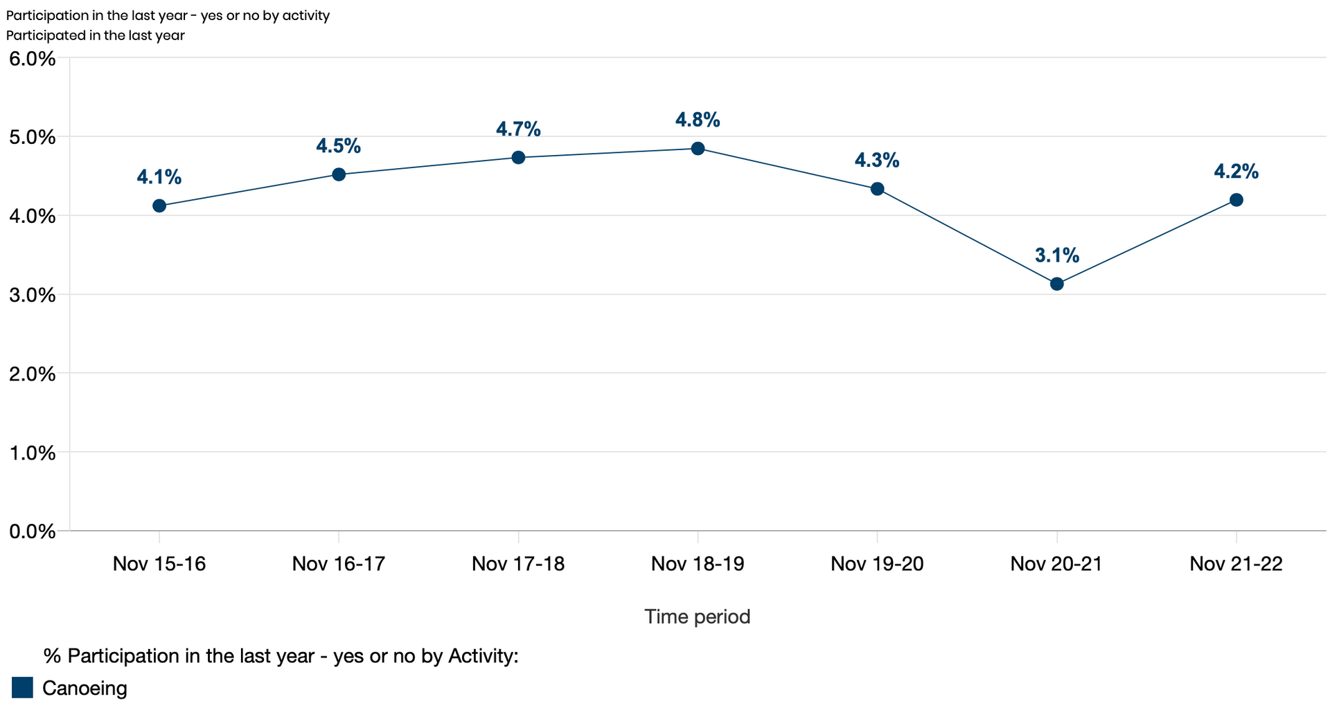 Prior to the pandemic, participation in canoeing was on an upward curve and is showing good signs of recovery among casual participants. Rates for regular participants have been around the 0.4% mark for the last few years.