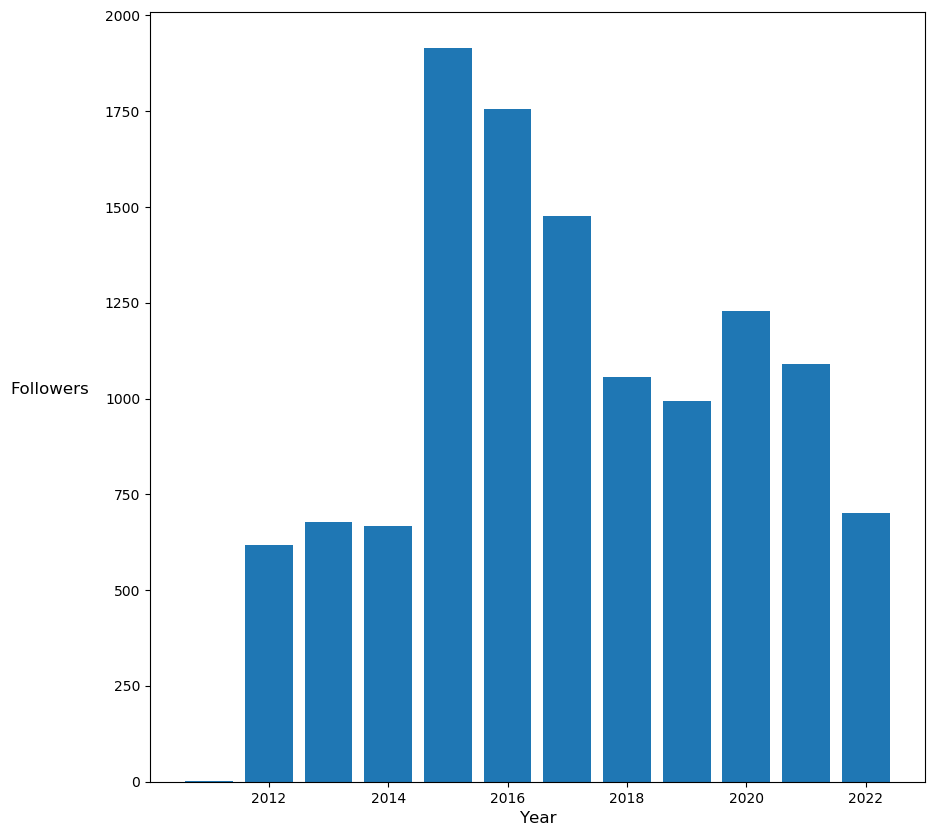 The graphic shows the number of new followers on Twitter for each year since 2011.