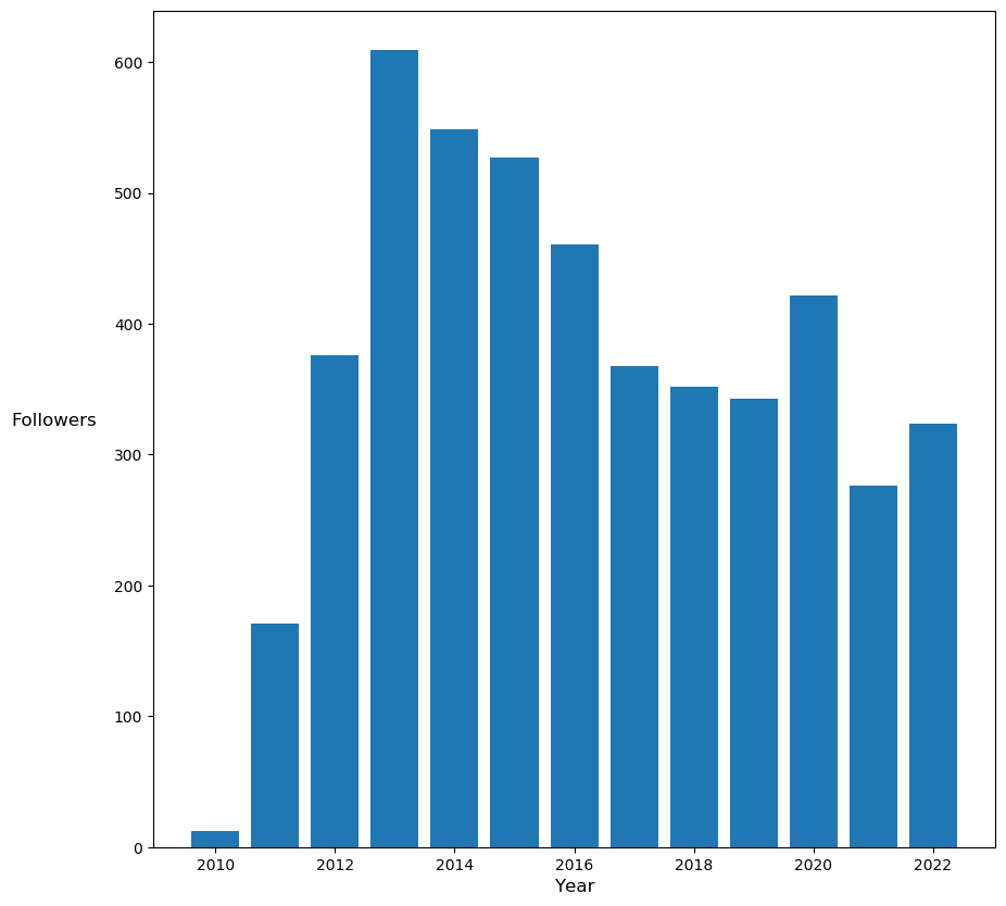 The graphic shows the number of new followers on Twitter for each year since 2010.