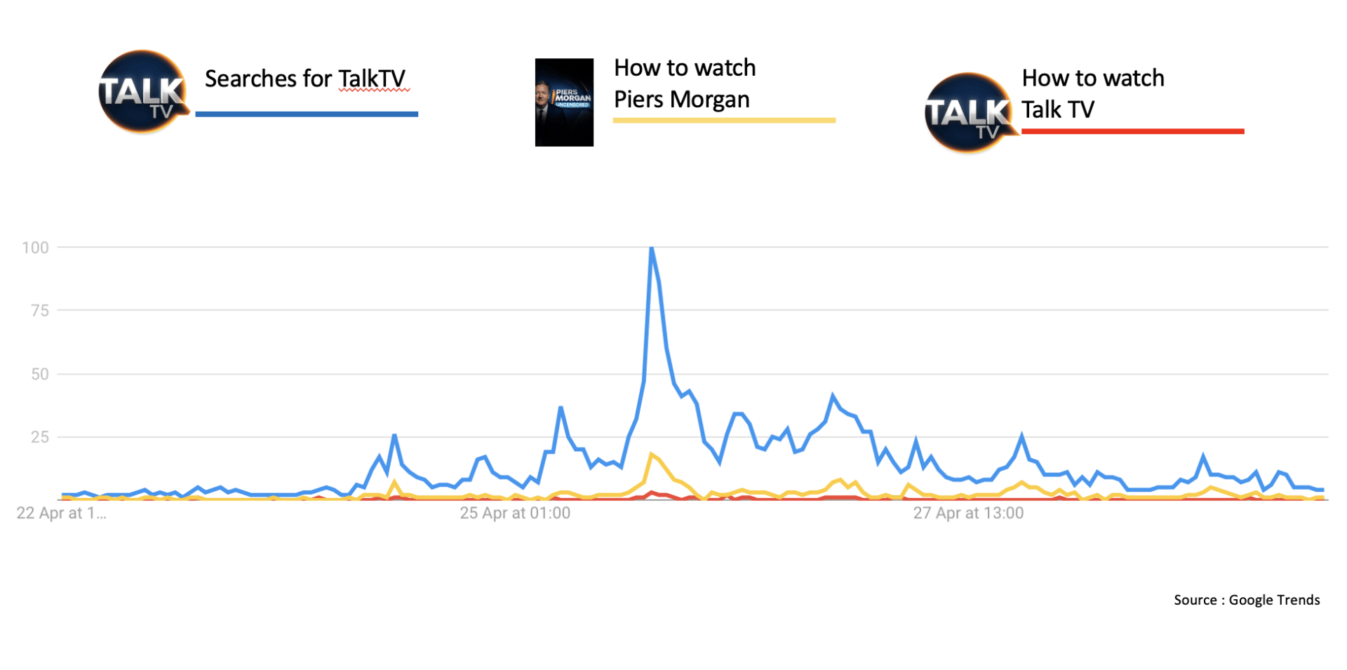 To illustrate, we show trends in Google searches relating to the launch in the UK of TalkTV on 25th April and more specifically Piers Morgan's new interview show (Piers Morgan Uncensored) that was the centrepiece of the launch.