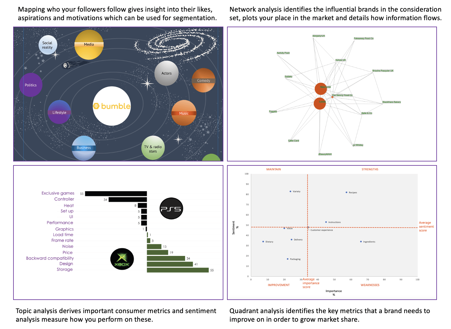For more in-depth insight you can map your network by plotting who your followers on Twitter and Instagram also follow. This map, known as network analysis, shows a brand who else is in their consideration set and the hierarchy of importance to consumers of the different brands.