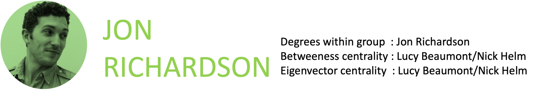 Dara O'Briain has the most connections and therefore the largest node. Dara also performs very highly on what are known as network centrality measures. These are important because they identify the biggest influencers in the network. O'Briain has the highest degree centrality measure. This is a measure of the number of connections a node has. Important nodes have more connections and none are more important than Dara O'Briain.