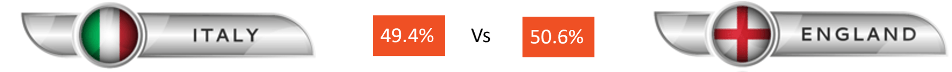 Both teams benefited from the draw but England more so. Italy were drawn on the harder side but had easier opponents in Austria in the round of 16. Italy had a 75% probability of winning that game although they needed extra time to do so. England were drawn on the easier side playing their potentially most difficult fixture, Germany, at home. England had a 53% probability of beating Germany which was their lowest probability of winning any match up until the final.