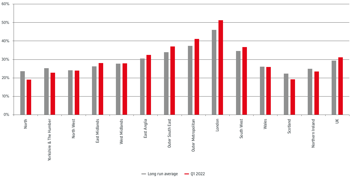 For the UK as a whole, on average, first-time buyers need to spend over 30% of their take home pay on a mortgage. In London it is over 50%. In the counties immediately surrounding London (known as outer metropolitan) it is over 40%. In the South East, South West and East Anglia it is over 30% of net income. These are historically high rates of unaffordability compared with the long run average.