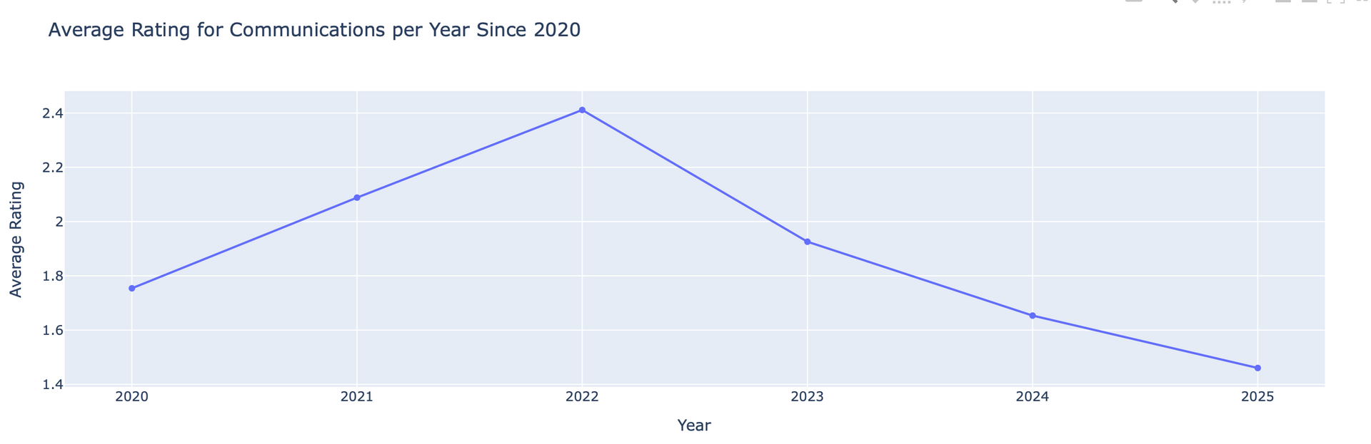 Trustpilot feedback makes it clear that communications is IWOOT’s Achilles’ heel – and it’s getting worse. Mentions of email, live chat, messages and customer service consistently pull ratings down to around 2 stars, well below the brand’s overall Trustpilot average of 3.7. More worryingly, our year-by-year analysis shows communications scores peaked in 2022 but have since been in steady decline, hitting just 1.45 so far this year.
