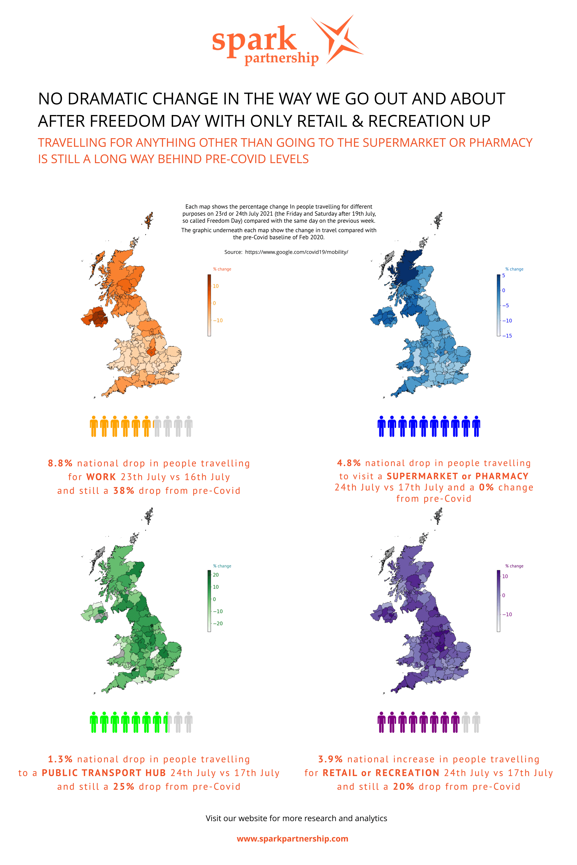 The graphics show that Freedom Day was a bit of a damp squib. Comparing the Friday or Saturday prior to Freedom Day with the Friday and Saturday after 19th July shows very little changed, at least at the UK level.