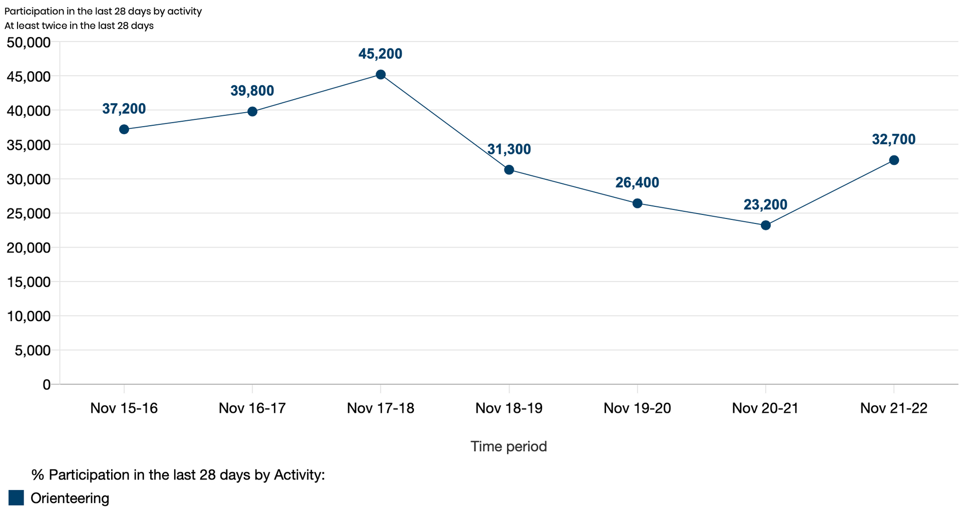 Data from Sport England's Active Lives Survey shows that 32,700 adults did orienteering regularly (twice in the last 28 days) in the year to November 2022. This is an increase on the pre pandemic level of participation but significantly down from its 2017/18 high point.