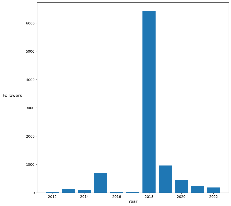 The graphic shows the number of new followers on Twitter for each year since 2010.