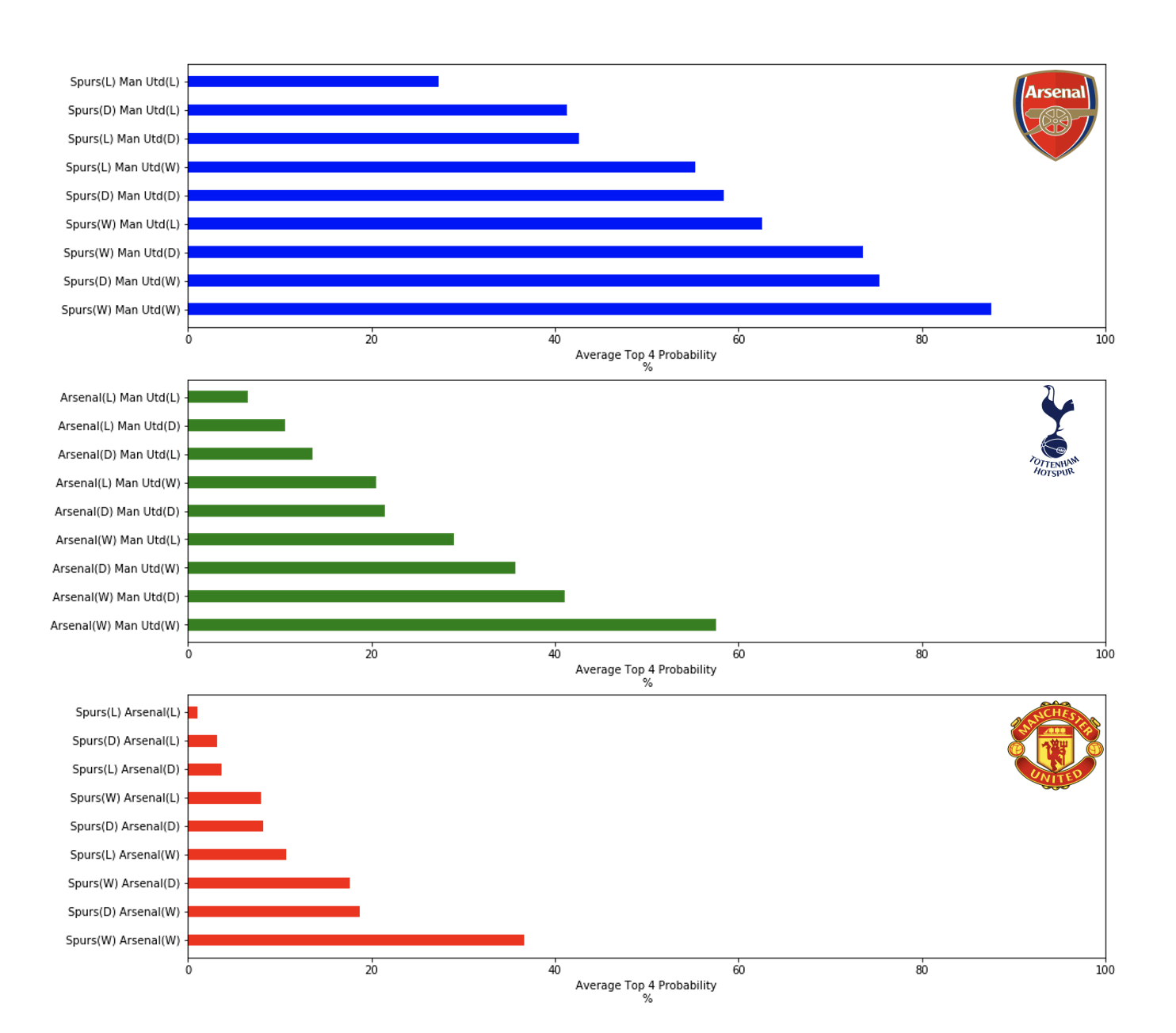 Tottenham have more acceptable options than Manchester United as even beating Arsenal but losing to Manchester United would give them a 29% chance of achieving top 4 .