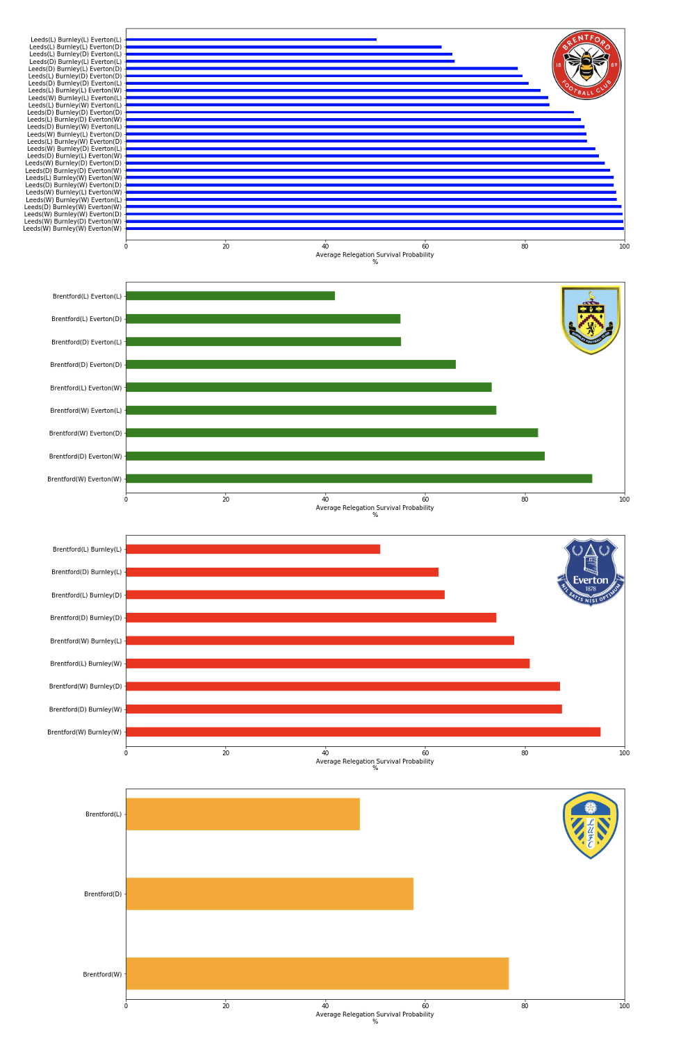 Brentford have the most 6-pointers as they play Leeds, Burnley and Everton in the run in. Win all three and their chances of survival are almost 100%. However, even if they lose two of these matches as long as they win the other one, their chances of survival would still be over 80%.
