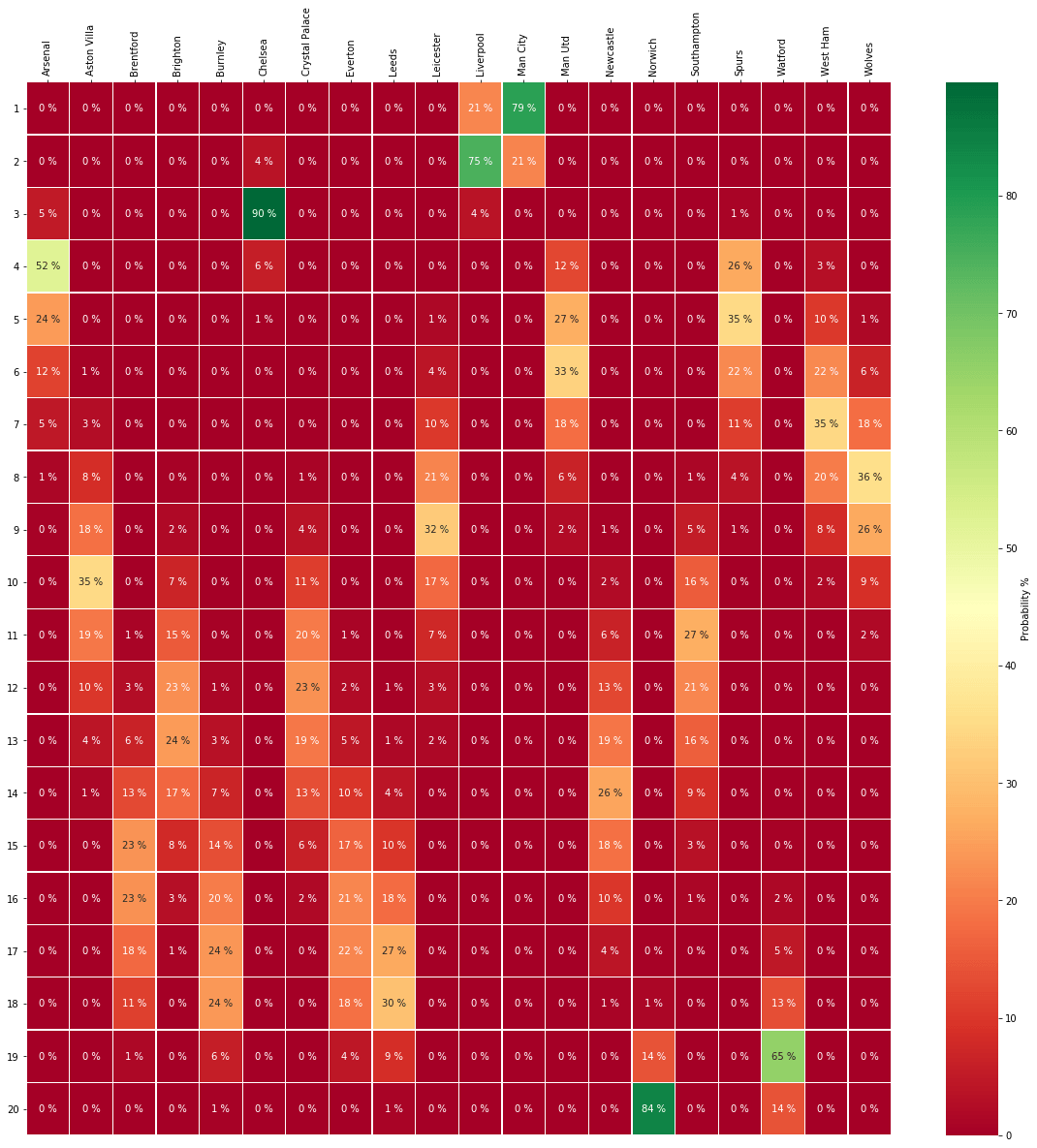 As the heat map shows, the title is still Man City’s to lose. Despite losing against Spurs our model gives them a 79% chance of winning the league this season. This probability is way ahead of Liverpool's at 21%. This is due to Liverpool having the more difficult run in: they play Man United, Spurs and Arsenal as well as Man City away from home.