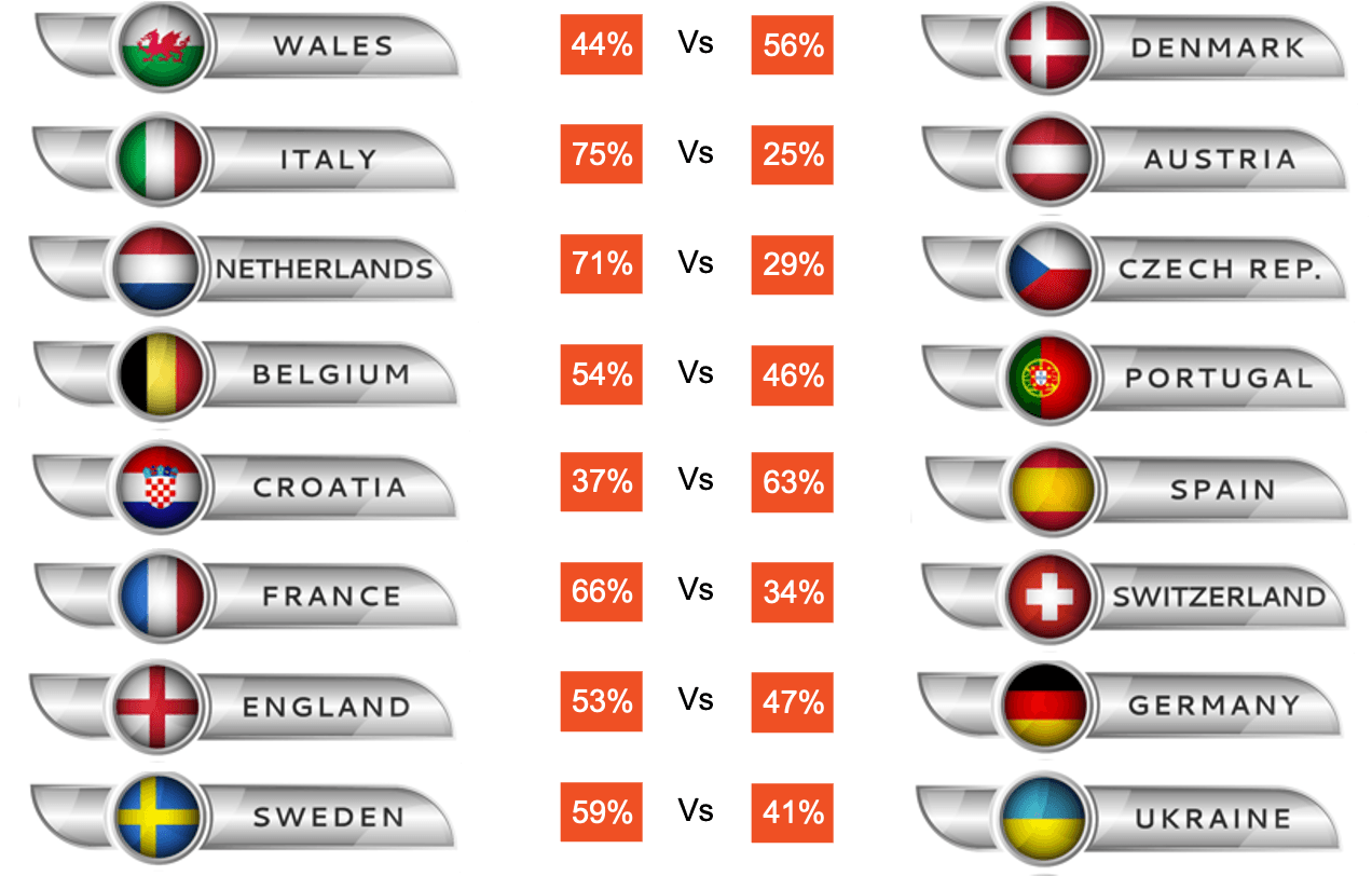 Italy has the highest probability of progressing at 75% with Netherlands not far behind at 71%. Based on probabilities, Belgium v Portugal also looks to be close.