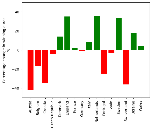 The graphic below clearly reveals that teams in England's half of the draw have had their chances of winning the Euros improved by being on this side of the draw. The exception to this is Germany whose chances have reduced against the average due to England's home advantage in R16. England's chances have also improved due to home advantage.