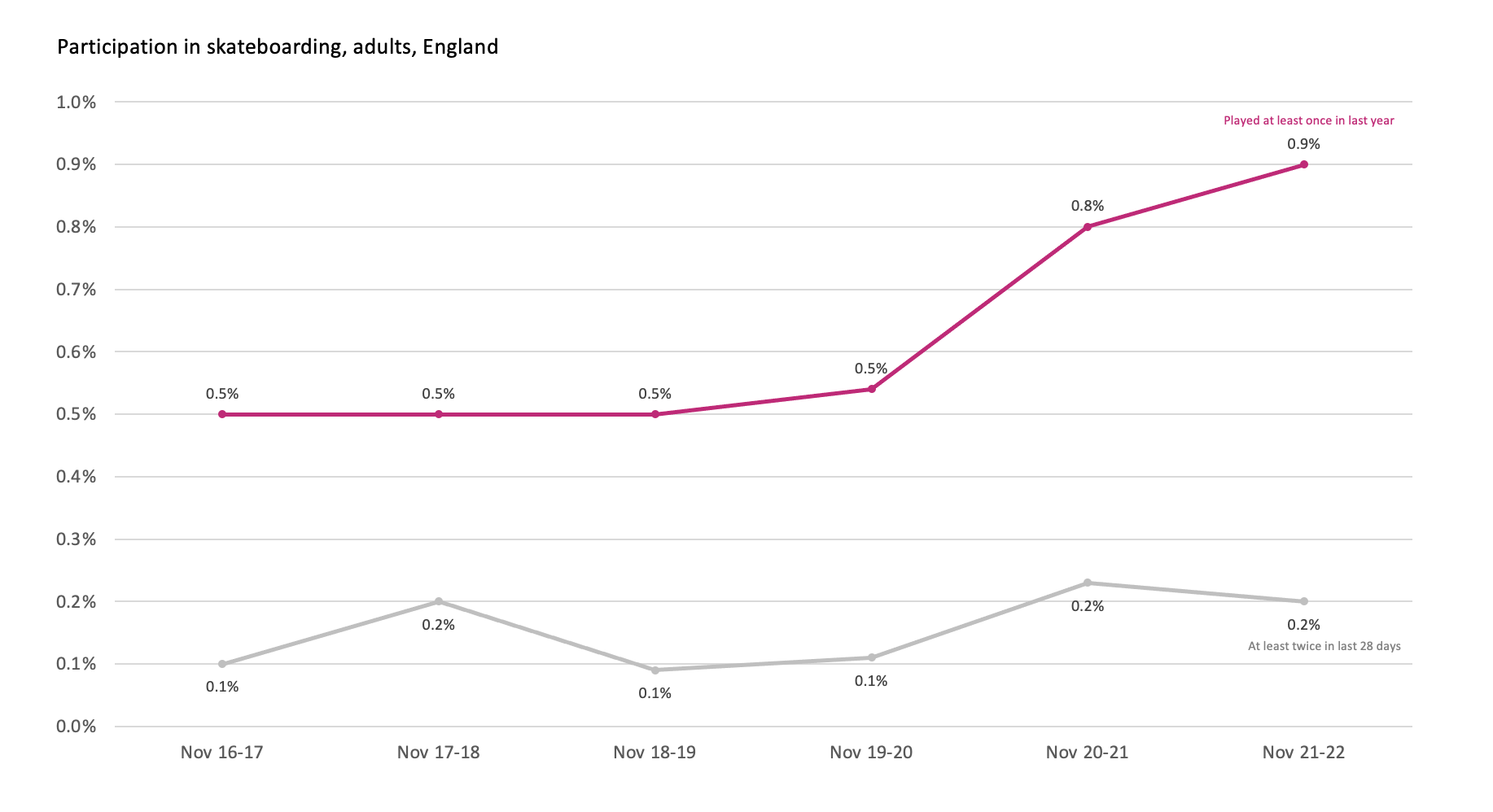 Interestingly, the proportion who have done at at least once in the last year is on an upward trajectory since the pandemic. The challenge is to get these casual skateboarders to become regular participants.