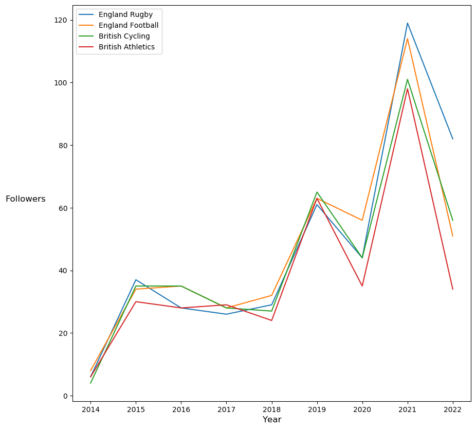 - Currently you have just under 4,000 Twitter followers. After a huge peak in 2021 the number of new followers fell. At the same time, however, participation, at least in England, is going up. There's an opportunity here to engage with people (including the parents of children) who might be interested in taking up skateboarding. We recommend developing a social media strategy for increasing the number of new followers every year at a higher level than the existing trend.