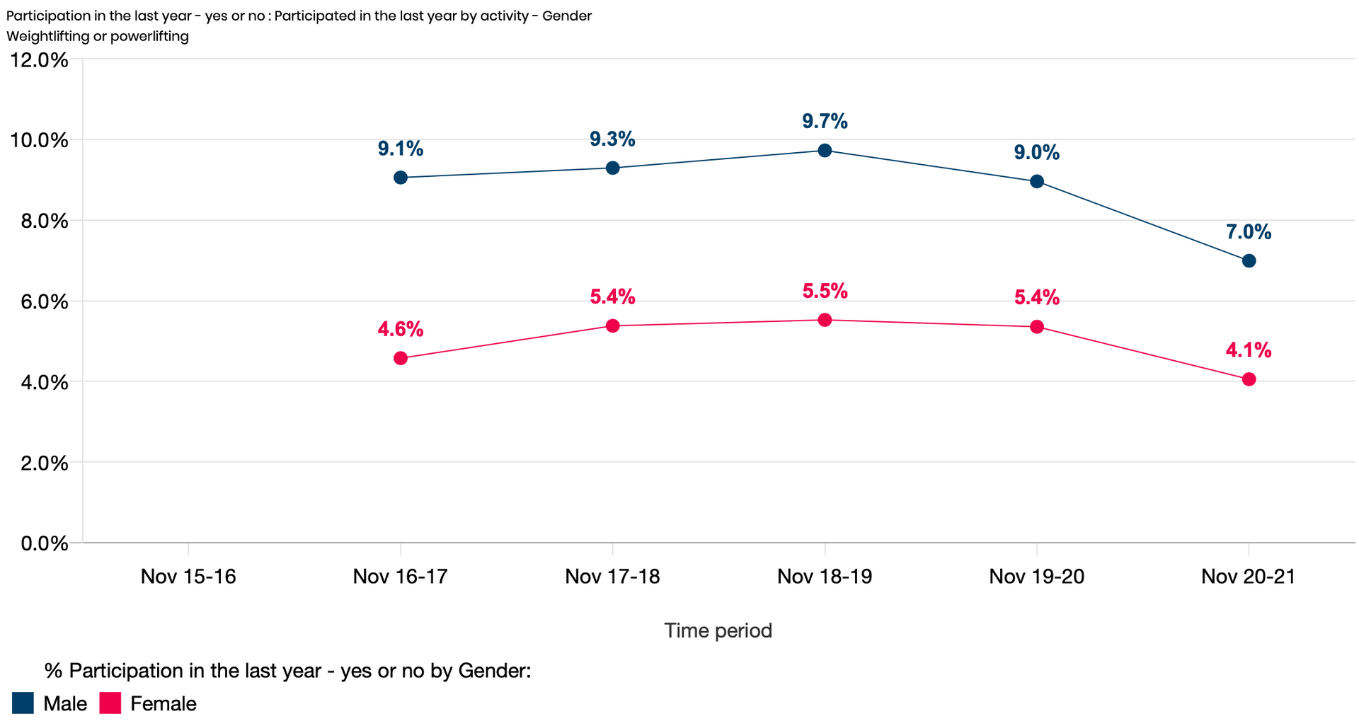 Data from Sport England's Active Lives Survey shows that participation in weightlifting or powerlifting at least once in the last 12 months has fallen from 7.6% in 2018/19 to 5.5% in 2020/21 (the most recent year for which data are available).