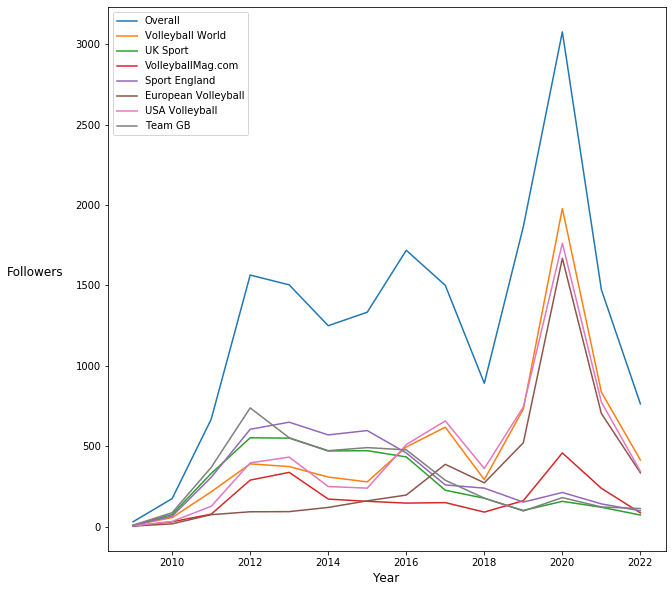 - Currently you have just under 18,000 Twitter followers. We recommend developing a social media strategy for increasing the number of new followers every year at a higher level than the existing trend. Research to identify the range of Twitter accounts followed by people who would be ideal followers of Volleyball England should be undertaken and a programme put in place to encourage them to follow you.