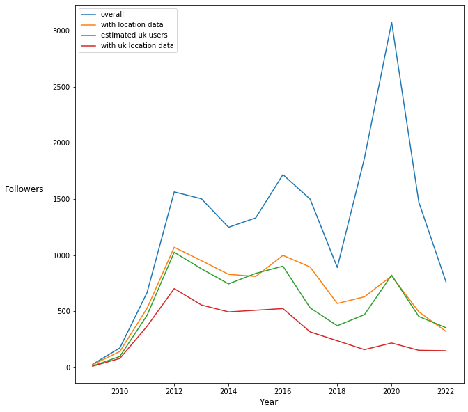 The red line in the first chart shows that the number of new followers located in the UK (who opted in to give location data) has declined. If we assume that the people who did not give location data follow the same pattern as those who did (shown by the green line), the suggestion is that the bulk of new followers are not from the UK.