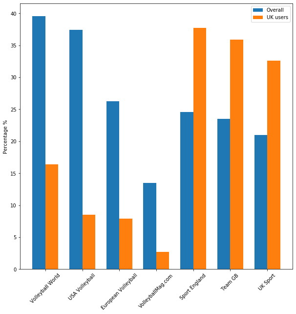 This chart shows the number of shared followers between Volleyball England and a selection of important associated accounts.