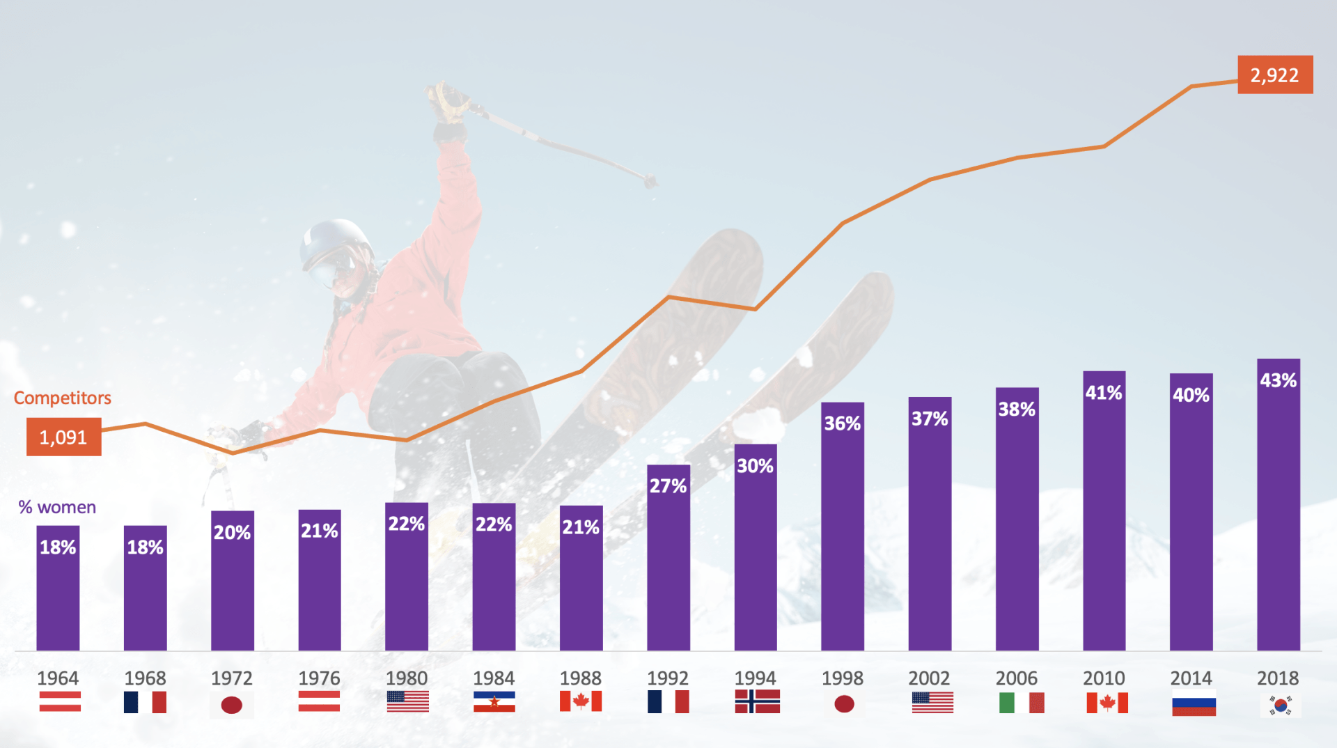 At the 1964 winter Olympics in Innsbruck and the 1968 one in Grenoble, fewer than 1 in 5 competitors were women. It took thirty years for that figure to double to 36% (Nagano, Japan, 1998). By the time we get to Pyeonchang in 2018, we still only had 43% of competitors being women.